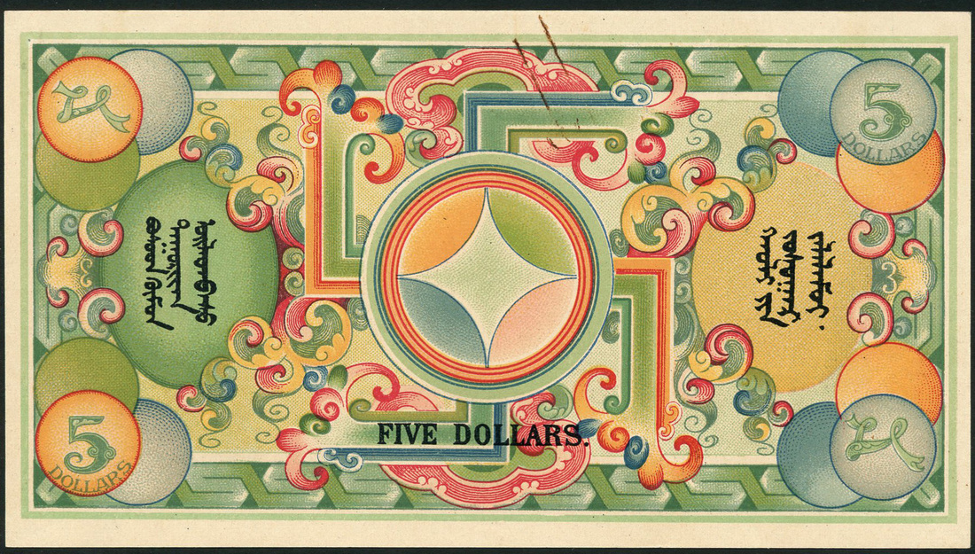 (x) Mongolia State Treasury, $5, 1921, serial number 0047087, multicolour, ornate design featuring swastika at centre, value at each corner