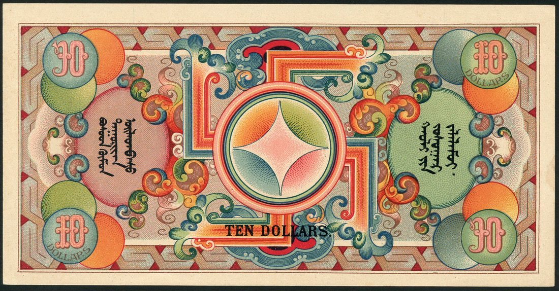 (x) Mongolia State Treasury, $10, 1921, serial number 0032985, multicolour, ornate design featuring swastika at centre, value at each corner