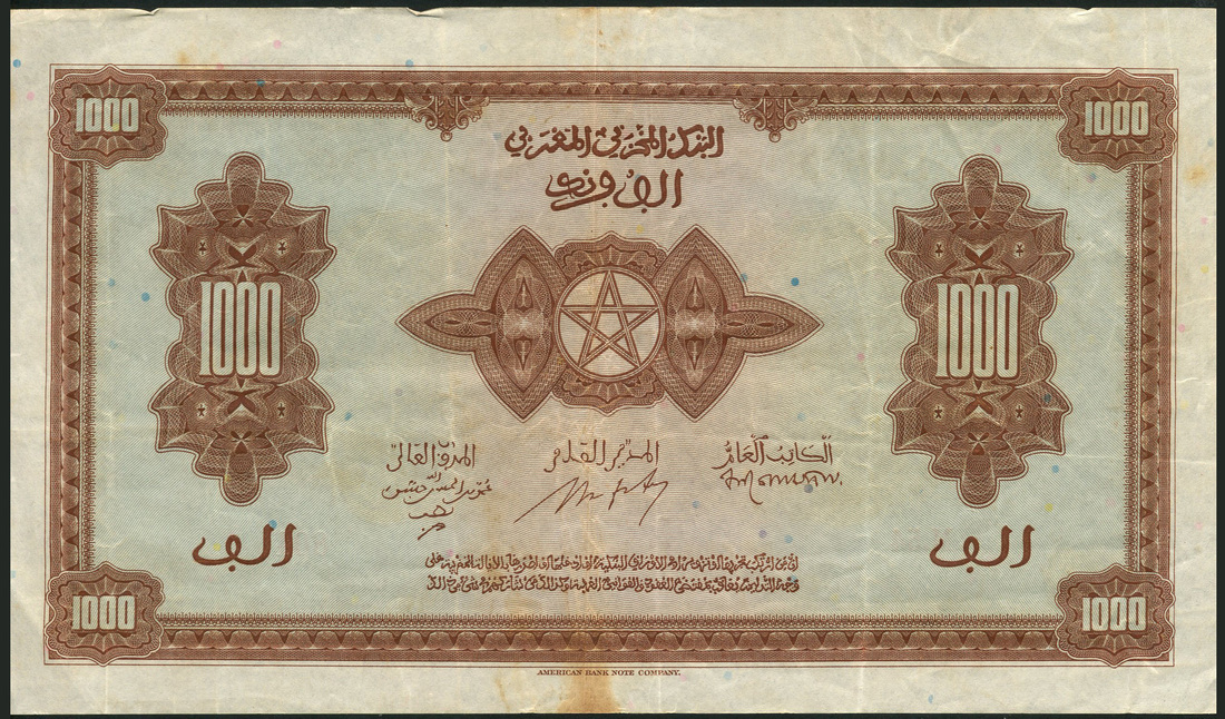 Banque d'Etat du Maroc, 1000 francs (2), 1 August 1943, serial number M.54 1336804, 1 March 1944, serial numberK.27 6884685 brown on pale blue underprint, value at left and right and at each corner