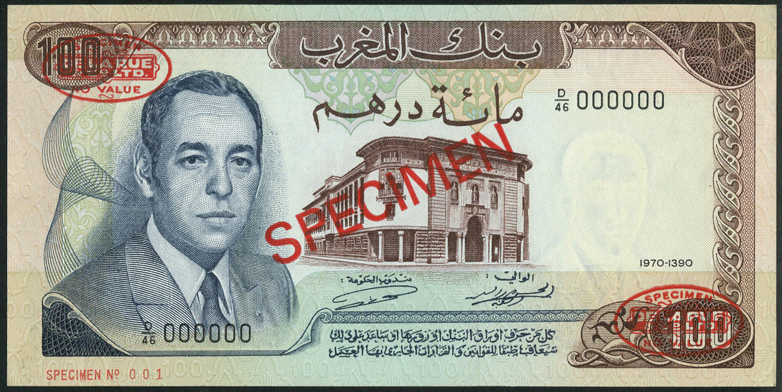 (†) Banque du Maroc, a group of specimens of the 1970 Issue, all King Hassan II at left, zero serial numbers, comprising 5 Dirhams (2), prefixes A/41, A86, violet; 10 Dirhams, prefix B/51, brown; 100 Dirhams, prefix D/46, brown, slate-violet and green, all overprinted SPECIMEN in red with two De La Rue specimen ovals on obverse and reverse, two punch holes