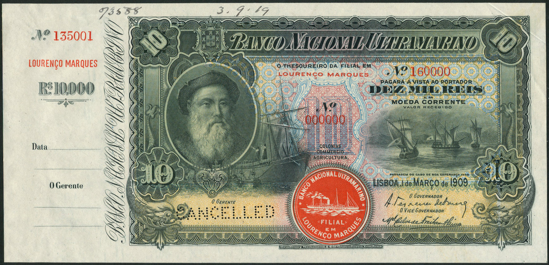 (†) Banco Nacional Ultramarino, Mozambique, printer's archival specimen 10 Mil Reis with counterfoil, 1 March 1909, serial number run 000000 to 160000, black on blue and yellow underprint, portrait of Vasco da Gama at left, his ships rounding The Cape of Good Hope at right, steamship seal Type I at lower centre, red overprint LOURENCO MARQUES at upper centre, reverse brown, allegorical woman looking out at sailing ships, perforated CANCELLED