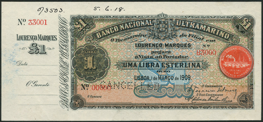 (†) Banco Nacional Ultramarino, Mozambique, printer's archival specimen 1 Libra Esterlina, with counterfoil, Lisbon, 1 March 1909, serial number run 0000 to 5666, black on pink, blue and yellow underprint, arms at top centre, value in guilloche at left, red steamship seal Type I at right, reverse, brown and pale blue, value in ornate guilloche, perforated CANCELLED