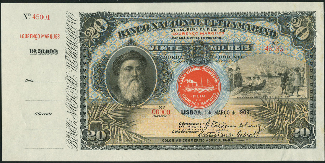 (†) Banco Nacional Ultramarino, Mozambique, printer's archival specimen 20 Mil Reis with counterfoil, 1 March 1909, serial number run 000000 to 48333, black on blue and yellow underprint, portrait of Vasco da Gama at left, his embarkation at right, steamship seal Type I at lower centre, red overprint LOURENCO MARQUES at upper centre, reverse orange-red, allegorical woman looking out at sailing ships, perforated SPECIMEN