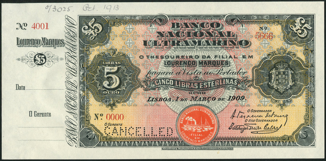 (†) Banco Nacional Ultramarino, Mozambique, printer's archival specimen 5 Libras Esterlinas, with counterfoil, Lisbon, 1 March 1909, serial number run 0000 to 5666, black on pink, blue and yellow underprint, arms at right, value in guilloche at left, red steamship seal Type I at lower centre, reverse, green, pale blue and yellow, value in ornate guilloche, perforated CANCELLED