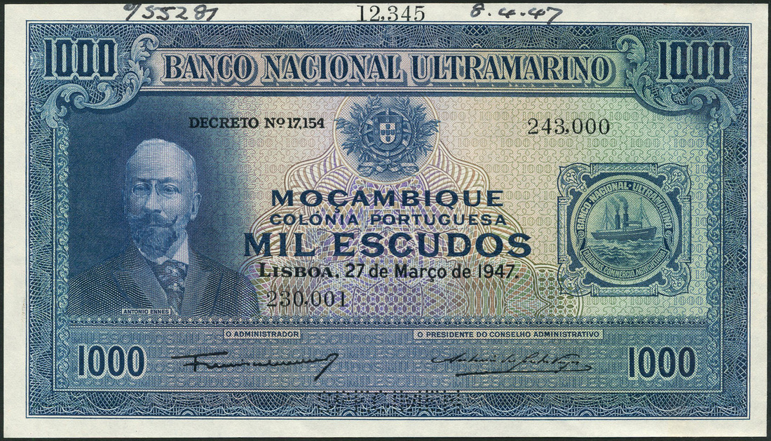 (†) Banco Nacional Ultramarino, Mozambique, printer's archival specimen 20 Escudos, 1 November 1941, serial run 1,120,001 to 1,160,000, blue; printer's archival specimen 50 Escudos, 1 November 1941, serial run 672,001 to 696,000, grey-green; printer's archival specimen 100 Escudos, 27 March 1941, serial run 720,001 to 760,000, purple; and 1000 Escudos, 27 March 1947, serial run 230,001 to 243,000, blue, all Antonio Ennes at left, reverse, allegorical woman looking out at sailing ships, all perforated SPECIMEN