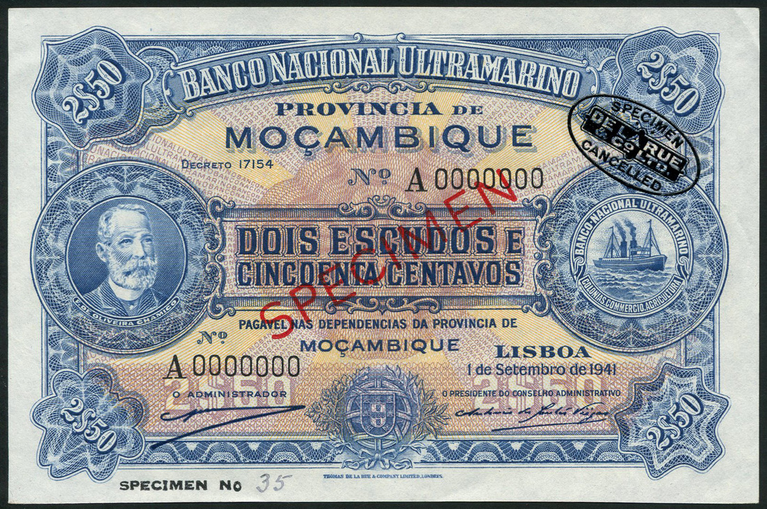 (†) Banco Nacional Ultramarino, Mozambique, specimen 2½ Escudos, 1 September 1941, serial number A0000000, blue on brown and yellow underprint, Chamico at left, steamship seal at right, black De la Rue oval seal on obverse; also specimen colour trial 5 Escudos, ND (1945), brown, Ennes at left, steamship seal at right, two punch holes, both reverse woman looking out at ships, both overprinted SPECIMEN in red on obverse and reverse