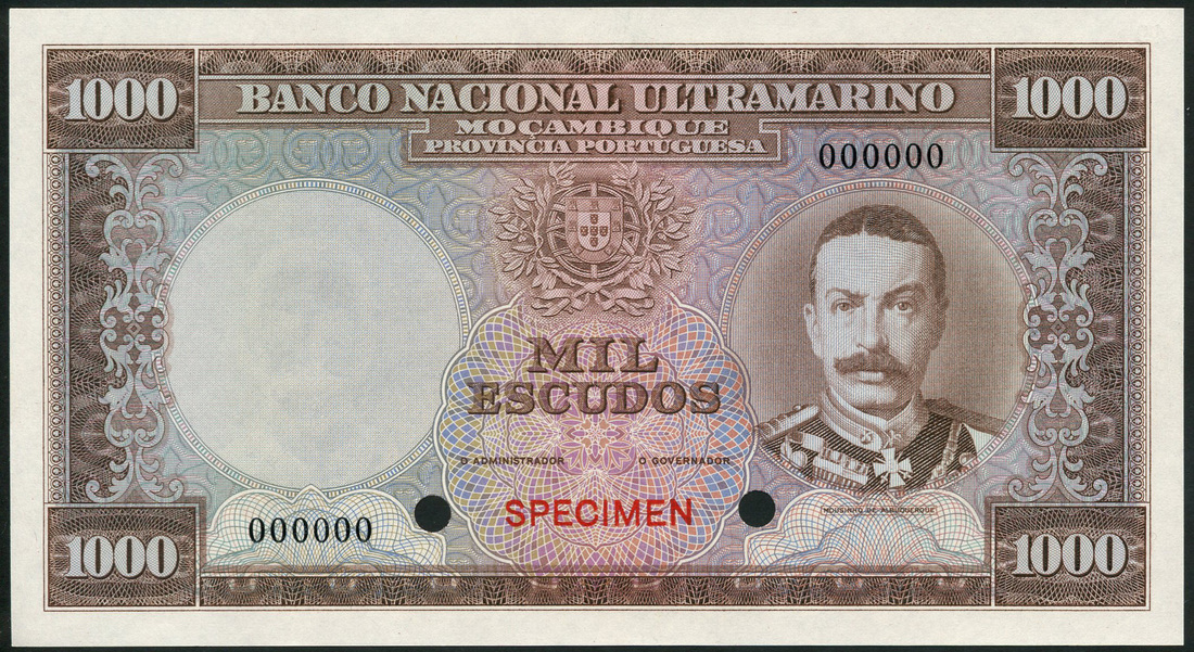 (†) Banco Nacional Ultramarino, Mozambique, specimen colour trial 500 Escudos, ND (c 1953), serial number 000000, deep green, Caldas Xavier at right; specimen colour trial 1000 Escudos, ND (1953) serial number 000000, brown, Mousinho de Albuquerque at right, both reverse coat of arms; also specimen colour trial 100 Escudos, ND (1961), serial number C 0000000, purple, Aires de Ornelas at right, reverse steamship seal at left; all overprinted SPECIMEN in red