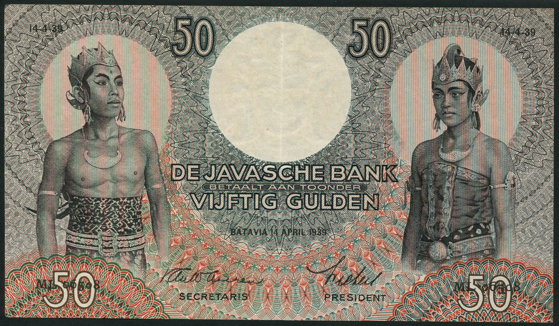 (x) De Javasche Bank, Netherlands Indies, 50 gulden, 14 April 1939, serial number ML 06508, black, red, brown and green, Javanese dancers at left and right