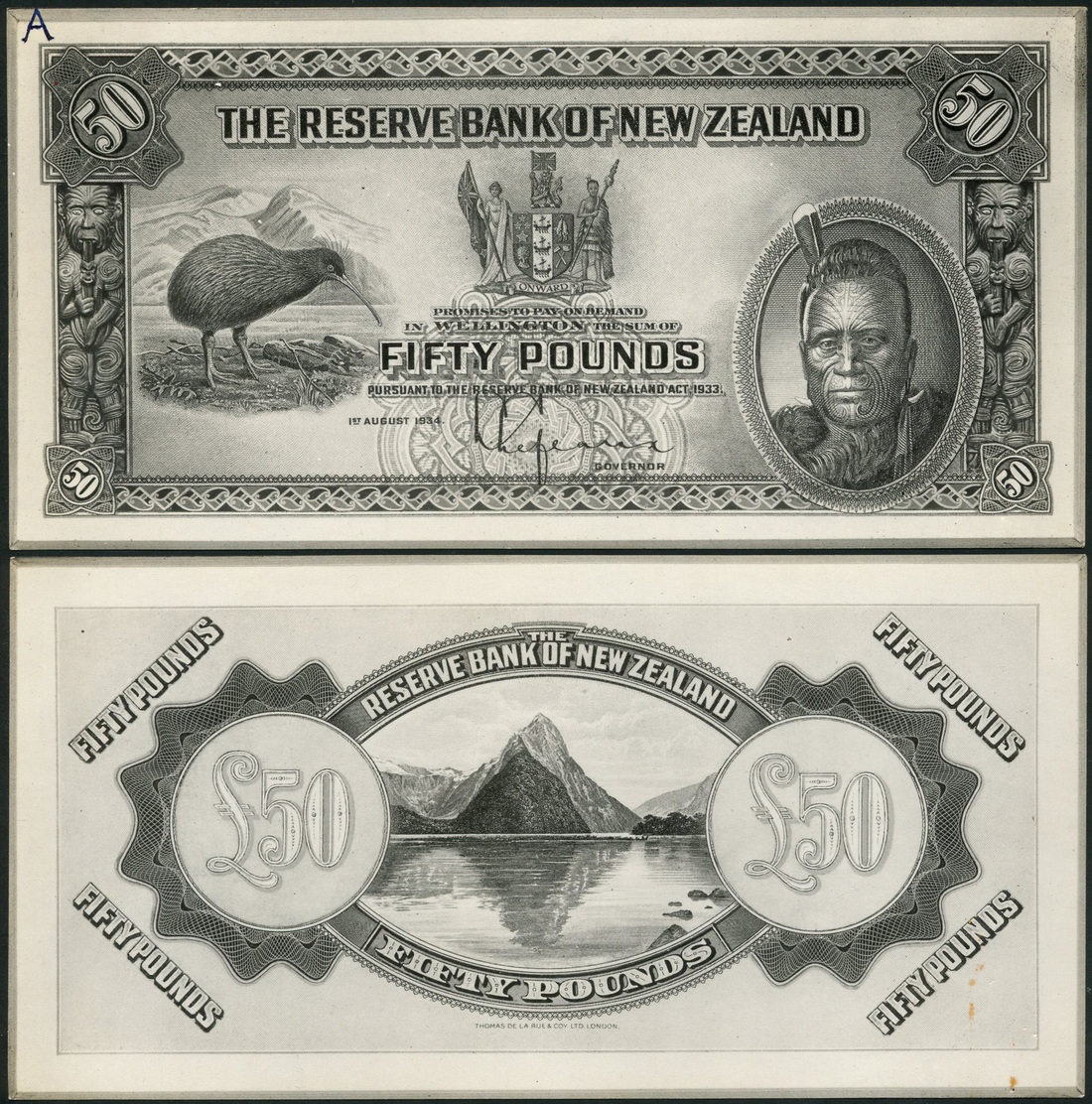 (†) Reserve Bank of New Zealand, obverse and reverse black and white archival photographs for 10 Shillings and £50, both 1 August 1934, Maori King Tawhiao at lower right, kiwi bird at left, reverse Mitre Peak and Milford Sound