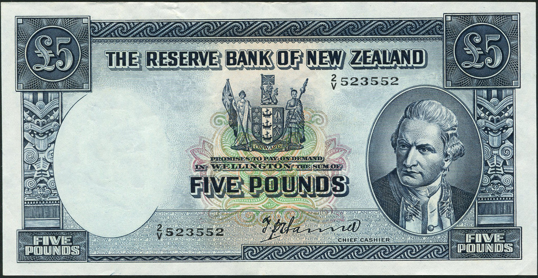 (x) Reserve Bank of New Zealand, £5, ND (1940), serial number 2V 523552, blue on multicolour, crowned arms at centre, Captain J. Cook at left, T.P. Hanna signature