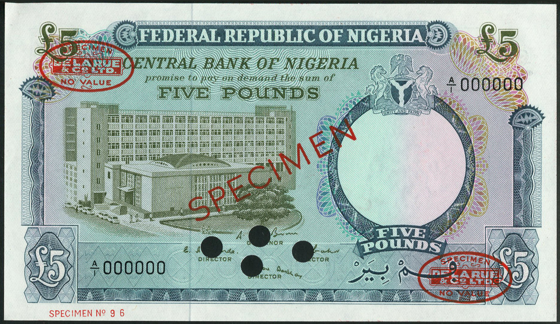 (†) Central Bank of Nigeria, a set of specimens, ND (1967) Issue, all Central Bank building at left, comprising 5 Shillings, serial number A/1 000000, lilac and blue, reverse logging; 10 Shillings, serial number A/12 000000, green and brown, reverse stacking groundnut sacks; £1, serial number A/1 000000, red, reverse man hacking date palm cluster; £5, serial number A/1 000000, blue and green, group preparing cocoa beans, all overprinted SPECIMEN in red with two De La Rue specimen ovals on obverse and reverse, four punch holes