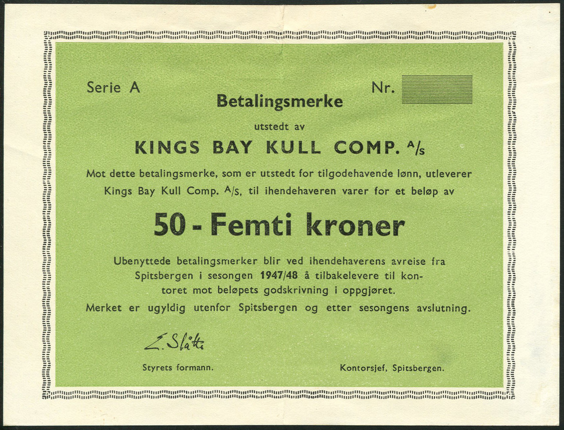 Norway, Store Norsk Spitsbergen Kulkonpani, 5 (2) and 10 øre, 1970-1976, manuscript signature low right, Kings Bay Kull comp. 50 femti kroner, 1947/48, Russian Spitsbergen, 1 kopek (2), 1957, orange and brown, 1961, brown and olive
