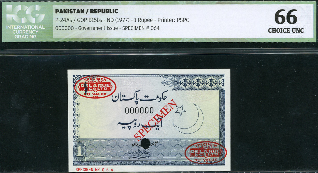 (x) Government of Pakistan, specimen 1 rupee (2), ND (1977), zero serial numbers, blue on pale green underprint, arms at right, reverse, Minar-i-Pakistan monument centre left