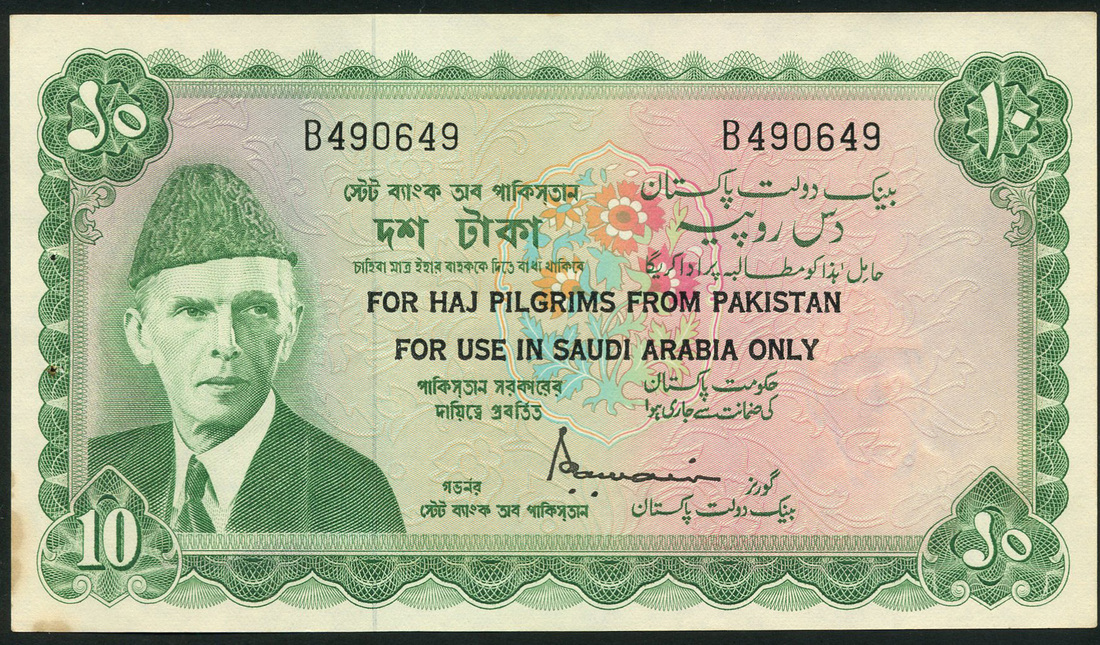 (x) State Bank of Pakistan, Haj issue, 10 rupees, ND (ca 1950), serial number B 490649, green and multicoloured, President Ali Jinnah at left, Durrani signature, black overprint FOR HAJ PILGRIMS FROM PAKISTAN FOR USE IN SAUDI ARABIA ONLY, reverse green, Shalimar Gardens, Lahore, at centre