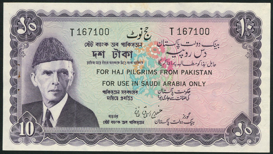 (x) State Bank of Pakistan, Haj issue, 10 rupees, ND (1972), serial number T167100, purple, 10 rupees, ND (1978), serial number A/5 989029, blue, and 100 rupees, ND (1978), serial number A/6 544720, orange, all with Jinnah at right
