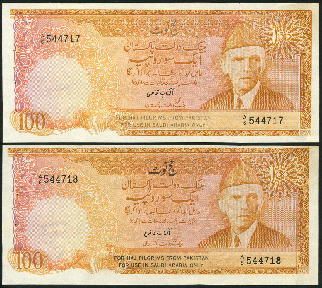 (x) State Bank of Pakistan, Haj issue. 100 rupees (2), ND (1978), serial numbers A/6 544717-18, orange, with Jinnah at right, Haj overprint on obverse