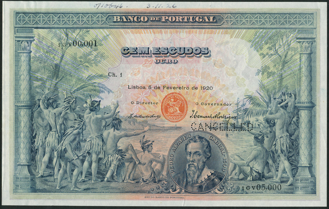 (†) Banco de Portugal, printer's archival specimen 100 Escudos, Lisbon, 5 February 1920, serial number run 1GV 00,001 to 1GV 05,000, blue on multicoloured underprint, medallion of Pedro Alvares Cabral at lower centre, natives on shoreline as Cabral's ships reach Brazil, reverse brown and multicoloured, Cabral's departure from Lisbon at centre, medallic female heads at left and right, perforated CANCELLED