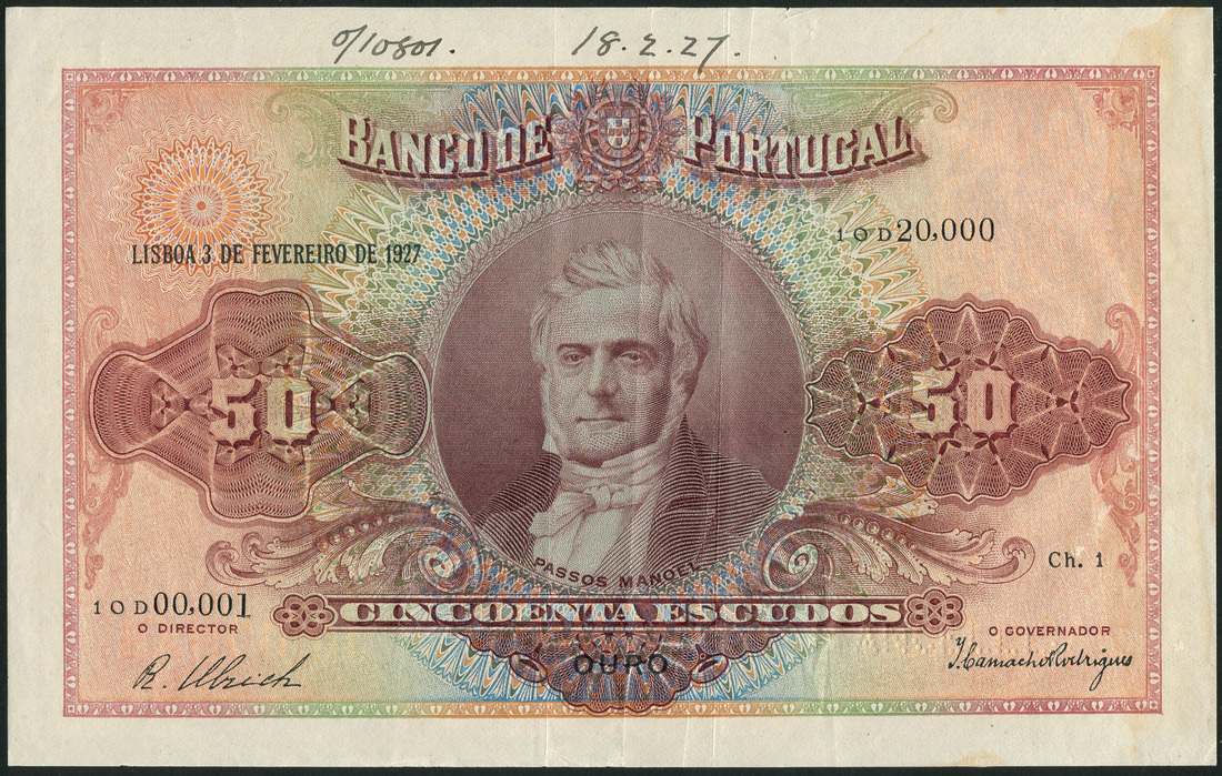 (†) Banco de Portugal, printer's archival specimen 50 Escudos, Lisbon, 3 February 1927, serial number run 1OD 00,001 to 1OD 20,000, red-brown on multicoloured underprint, portrait of Passos Manoel at centre, value at left and right, arms at top centre, reverse the Terreiro do Paco or Commerce Square, Lisbon in oval at centre, medallic female head at upper right, perforated CANCELLED