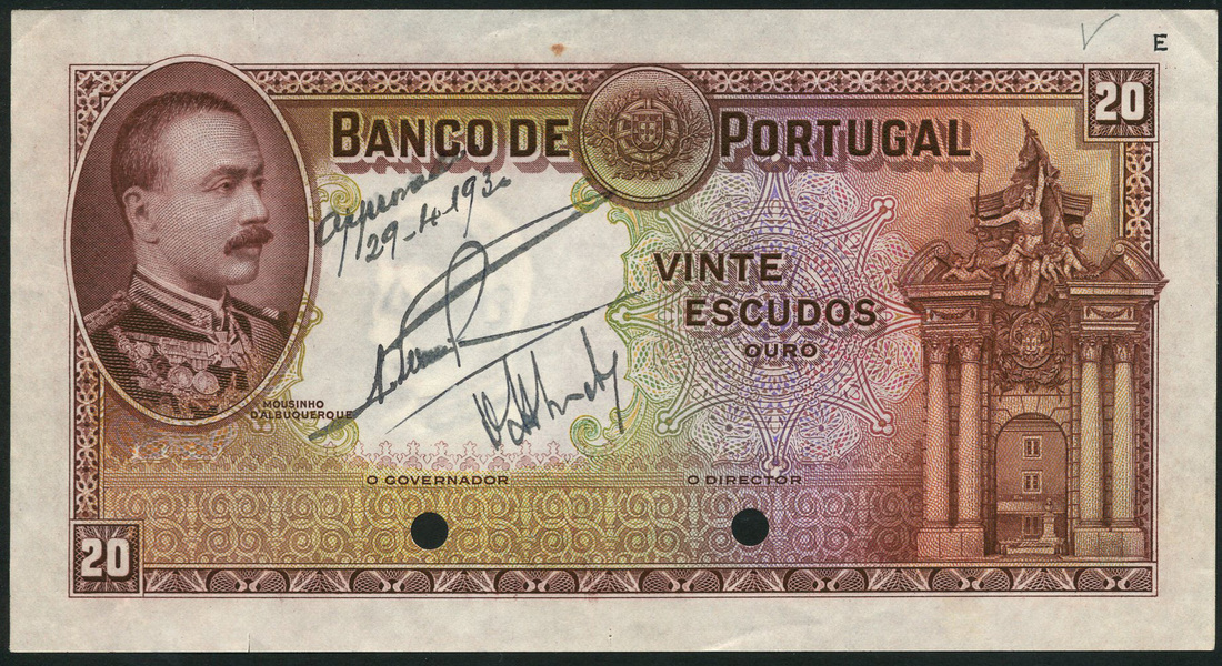 (†) Banco de Portugal, specimen proof 20 Escudos, ND (1930), no serial numbers, no signatures, brown and multicoloured, Mousinho d'Albuquerque in oval at upper left, archway at right, reverse lilac, Castelo de Guimaraes at centre left, value in ornate guilloches in each corner, two punch holes, sold with original annotated envelope