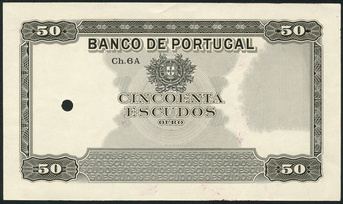 (†) Banco de Portugal, specimen die proof 50 Escudos, ND (1939), Ch. 6A, black and white, bank legend and arms at upper centre, value in each corner, repeat pattern 50 ESCUDOS in lower panel, uniface, one punch hole, sold with original Bradbury Wilkinson envelope annotated with 1939 date and reference to R. Ortigao