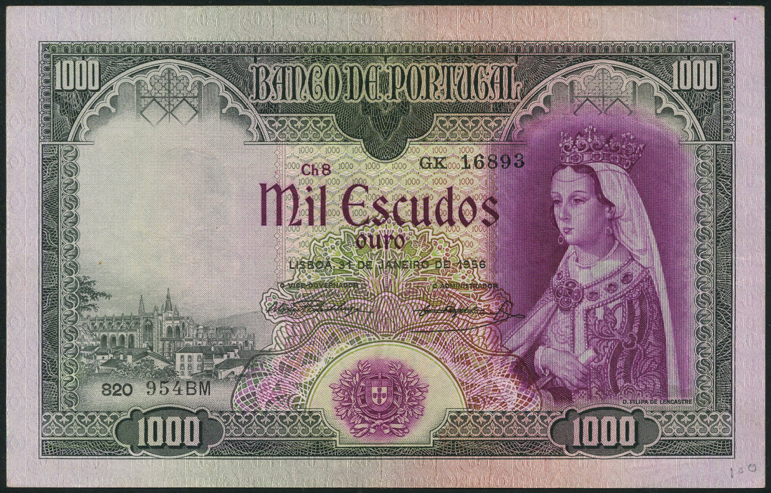 Banco de Portugal 1000 escudos, 31 January 1956, serial number GK16893, green, grey and purple Castle at left, Queen Filipa de Lencastre at right, 500 escudos, 17 May 1958, prefixes KJ, NG and RS, greenish grey and violet, Francisco de Almeida at right