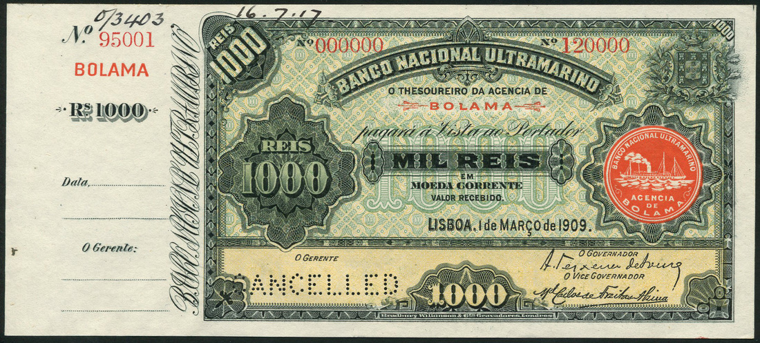 (†) Banco Nacional Ultramarino, Portuguese Guinea, printer's archival specimen 1000 Reis with counterfoil, 1 March 1909, serial run 95001 to 120000, black on green and yellow underprint, value at left, steamship seal Type I at right, red overprint 'BOLAMA', reverse black on green and pink underprint, woman looking at ships, perforated CANCELLED