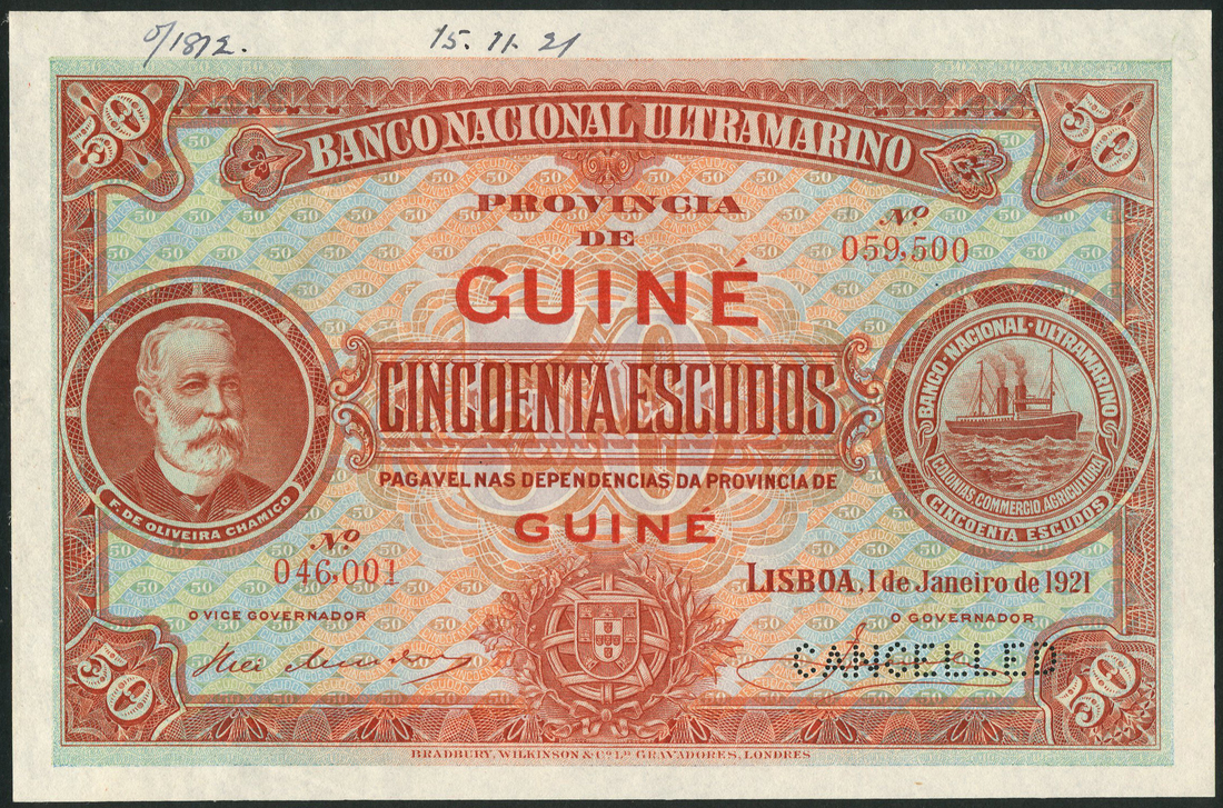 (†) Banco Nacional Ultramarino, Portuguese Guinea, printer's archival specimen 50 Escudos, 1 January 1921, serial number run 046,001 to 059,500, orange-brown and multicoloured, portrait of Francisco Oliveira de Chamico at left, steamship seal at right, arms at lower centre, value in each corner, reverse seated allegorical woman looking out at sailing ships, perforated CANCELLED