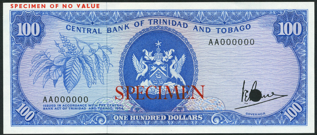 (†) Central Bank of Trinidad & Tobago, a set of specimens, Law of 1964 (1977) Issues, all serial number AA000000, all signature Victor E. Bruce, comprising $1, red; $5, green; $10, dark brown; $20, purple; $50, bistre; and $100, blue, all arms at centre, reverse old Central Bank building, all overprinted SPECIMEN horizontally in red or black on obverse and reverse, one punch hole