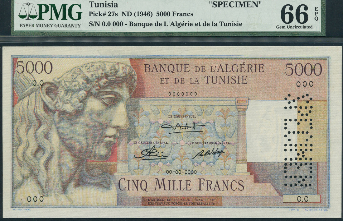 (x) Banque de l'Algerie et de la Tunisie, specimen 5000 francs, ND (1946), serial number O.0 000, multicolour, face of male statue at left, value at top left and right, perforated SPECIMEN