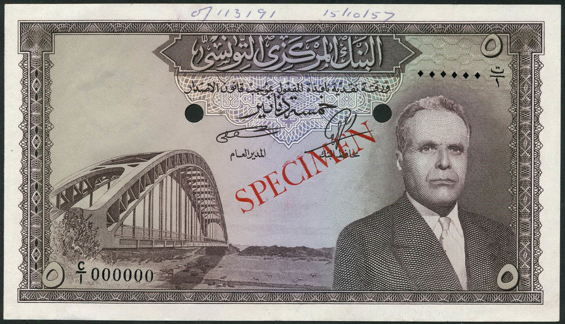 (†) Banque Centrale de Tunisie, printer's archival specimen 5 Dinars, ND (1958), serial number run C/1 000001 to C/4 1000000 in western numerals in top margin and in Arabic numerals in lower margin, C/1 000000 at lower left; also specimen 5 Dinars, ND (1958), serial number C/1 000000, overprinted SPECIMEN horizontally in red on obverse and reverse, two punch holes, both brown and multicoloured, President Habib Bourguiba at right, Mellegue River bridge at left, reverse interior columns of Great Mosque of Kairouan at left, arms at centre, branch with fruit at right