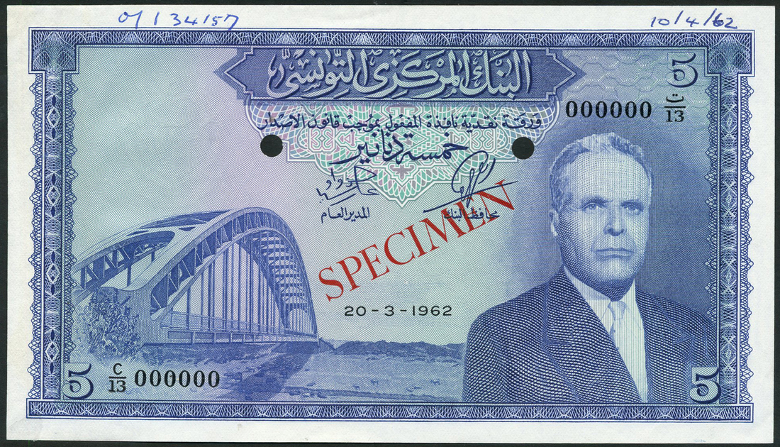 (†) Banque Centrale de Tunisie, specimen 5 Dinars, 20 March 1962, serial number C/13 000000, blue and multicoloured, President Habib Bourguiba at right, Mellegue River bridge at left, reverse interior columns of Great Mosque of Kairouan at left, arms at centre, branch with fruit at right; also specimen progressive proof 5 Dinars, ND (1962), blue and multicoloured, multicoloured pattern and underprint only on obverse, complete reverse as above