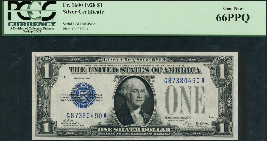 United States Silver Certificates, $1, 1928, serial number G87380490A, black and white, George Washington at centre, reverse, green