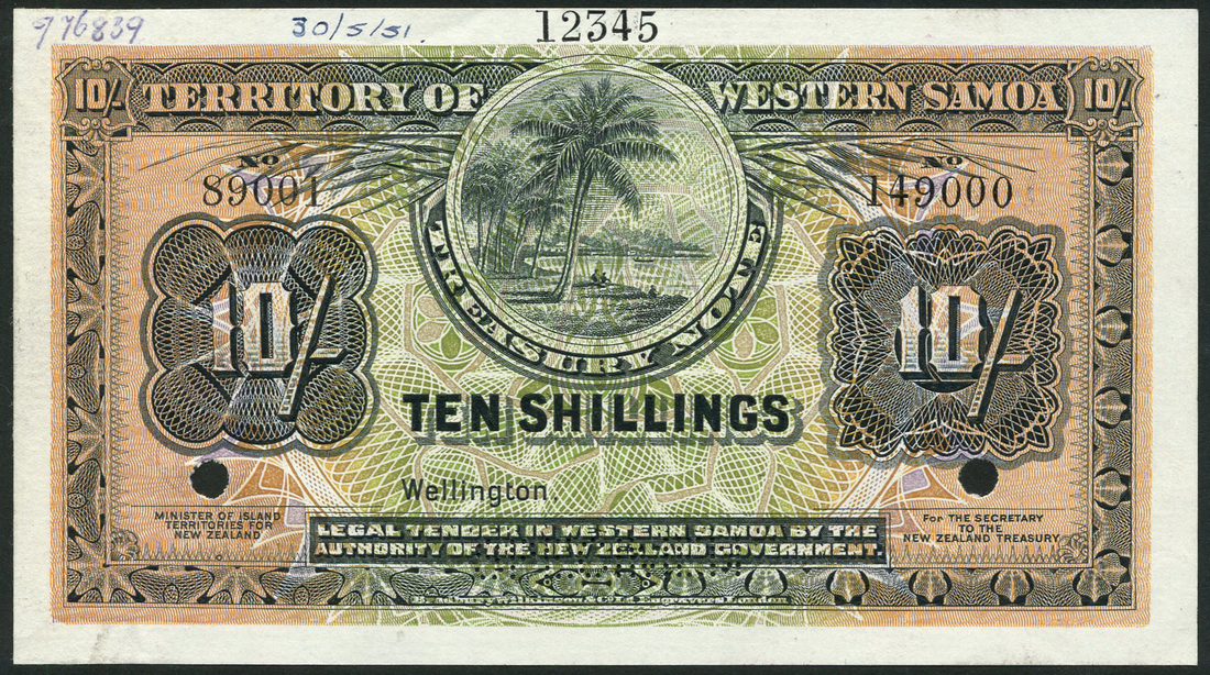 (†) Territory of Western Samoa, printer's archival specimen 10 Shillings, ND (1951), serial run 89001 to 149000, signature title MINISTER OF ISLAND TERRITORIES FOR NEW ZEALAND, brown, green and multicoloured, palm tree and beach scene at top centre, value in guilloches at left and right, reverse value in words and figures set in ornate guilloches, perforated SPECIMEN, two punch holes