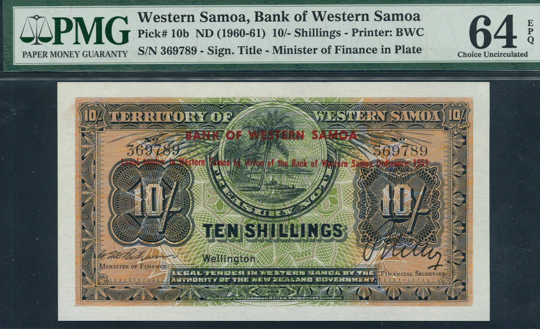 (x) Bank of Western Samoa, 10 shillings, Wellington, ND (1960-61), serial number 369789, black on multicolour underprint, palm trees at top centre, value at centre and left and right
