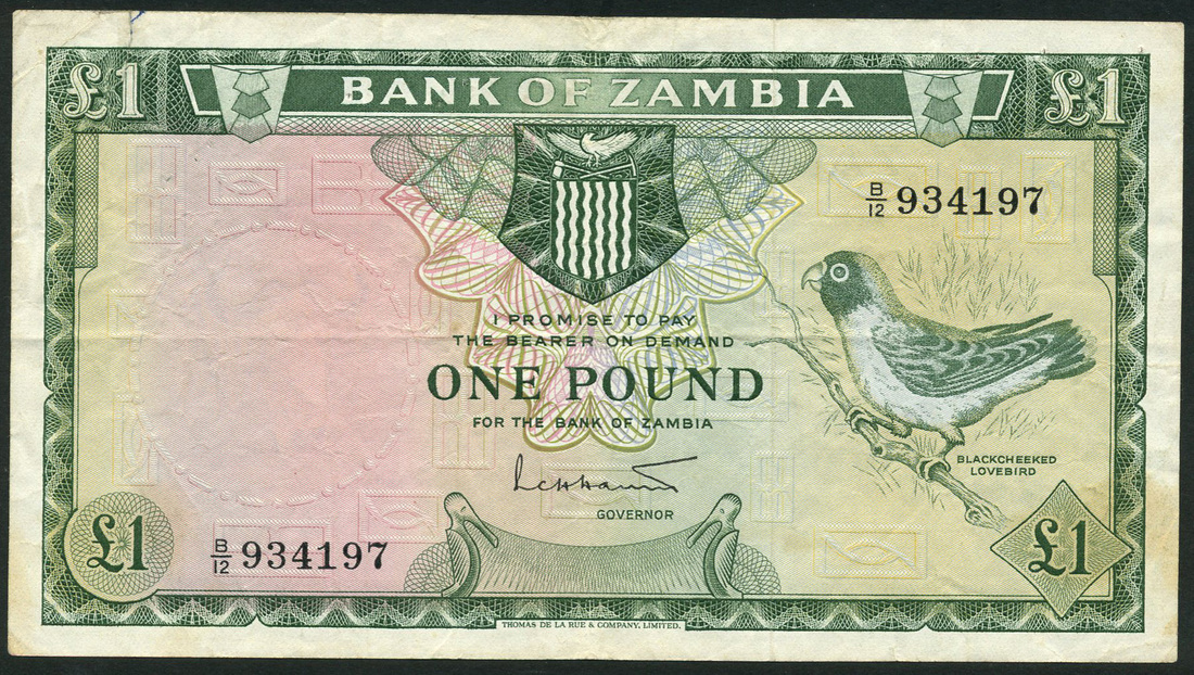 Bank of Zambia, £1, ND (1964), serial number B/12 934197, green on multicolour underprint, Blackcheeked Lovebird at right, arms at top centre, value at each corner, reverse green, copper mine at centre