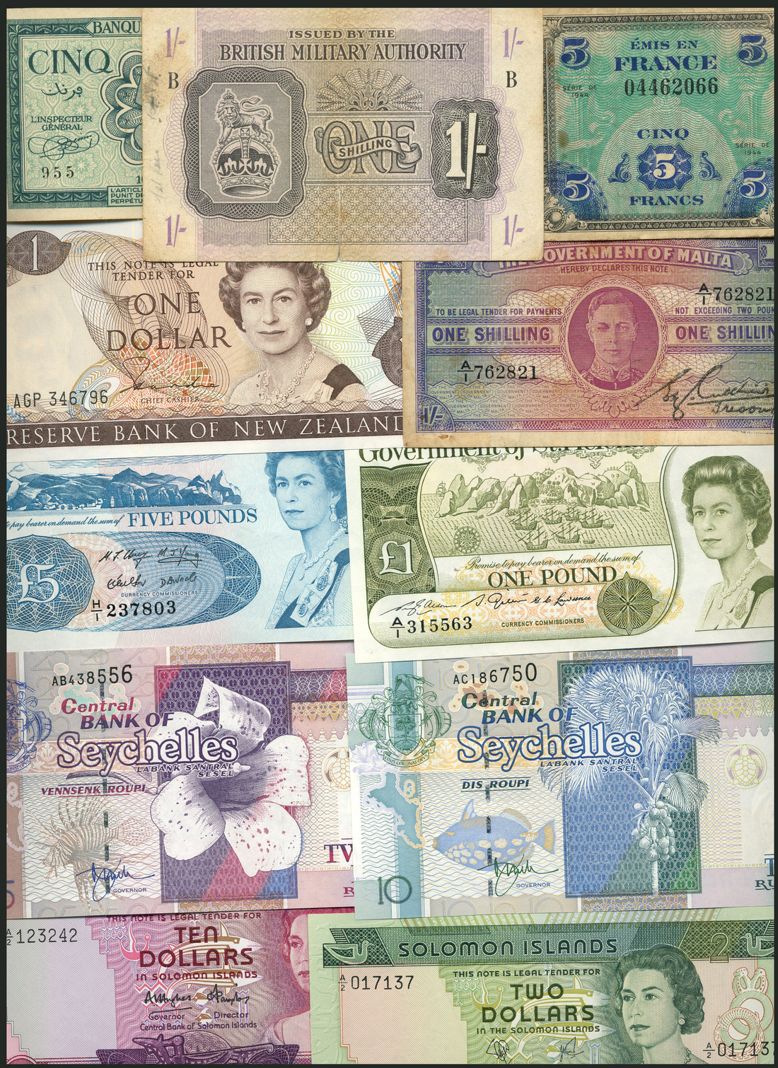 A group of world notes including the following Reserve Bank of New Zealand, $1, Government of St Helena, Government of Seychelles including £5, 1976, Solomon Islands, Trinidad and Tobago