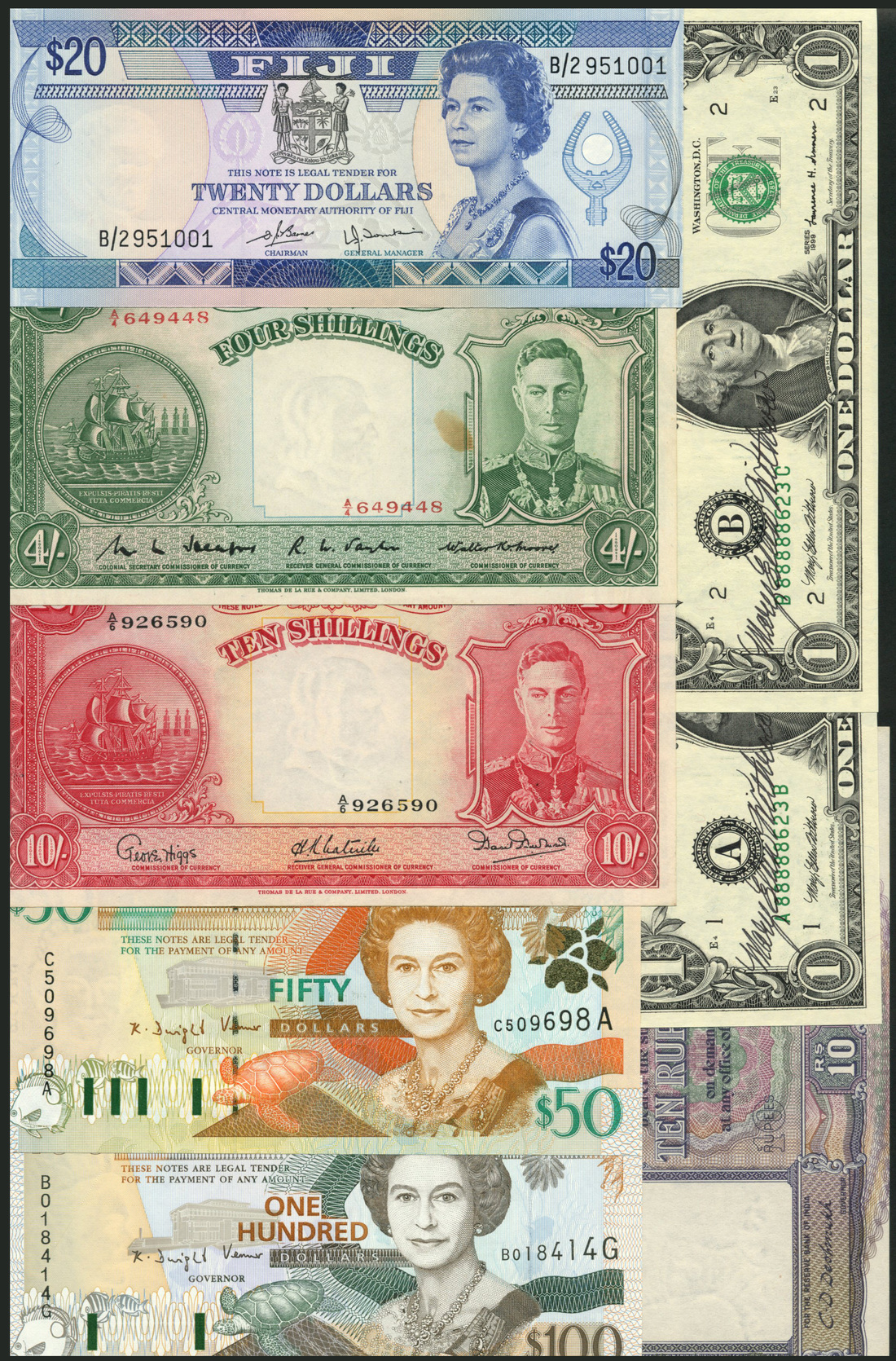 (x) a mixed group of World Banknotes, comprising the following, Bahamas Government, 4 shillings, ND (law of 1936), serial number A/4649448, green, George VI at right, ship seal at left, Heape, Taylor and Moore signatures, reverse, multicoloured arms at left, value at right, also 10 shillings, prefix A/6, red and pale orange yellow, Higgs, Latreille and Burnside signatures, Reserve Bank of India, 5 Rupees, ND, (1943), serial number L/6 956889, signature Deshmukh, brown and green, King George VI at right, reverse value in guilloche at left, bank seal at right; 10 Rupees, ND (1943), serial number B/50 584768, purple and multicoloured, King George VI at right, reverse dhow, Eastern Caribbean Central Bank, $100, ND (1994), $50, serial number B018414G, olive, green, black, blue and brown, Queen Elizabeth II at right, turtle low centre, tropical fish low left, reverse, Sir Arthur Lewis at left, map of islands at centre, Central Bank Building at right, also $50, ND (2000), serial number C509698A, blue, green, red and yellow, Queen Elizabeth at right, reverse, Brimstone Hill at right, map at centre and mountains at right, and United States Federal Reserve Bank, £1 (2), ND (1999), serial numbers A88888623B and B88888623C, George Washington at centre, both with printed and manuscript Treasurer signature, together with Central Monetary Authority, Fiji, $20, ND (1980), serial number B/2 951001, signatures Barnes and Tomkins, blue on multicoloured underprint, portrait of Queen Elizabeth II at centre right, coat of arms at upper centre, domodomo at right, reverse bure kalou with thatched roof at centre left, domodomo at left