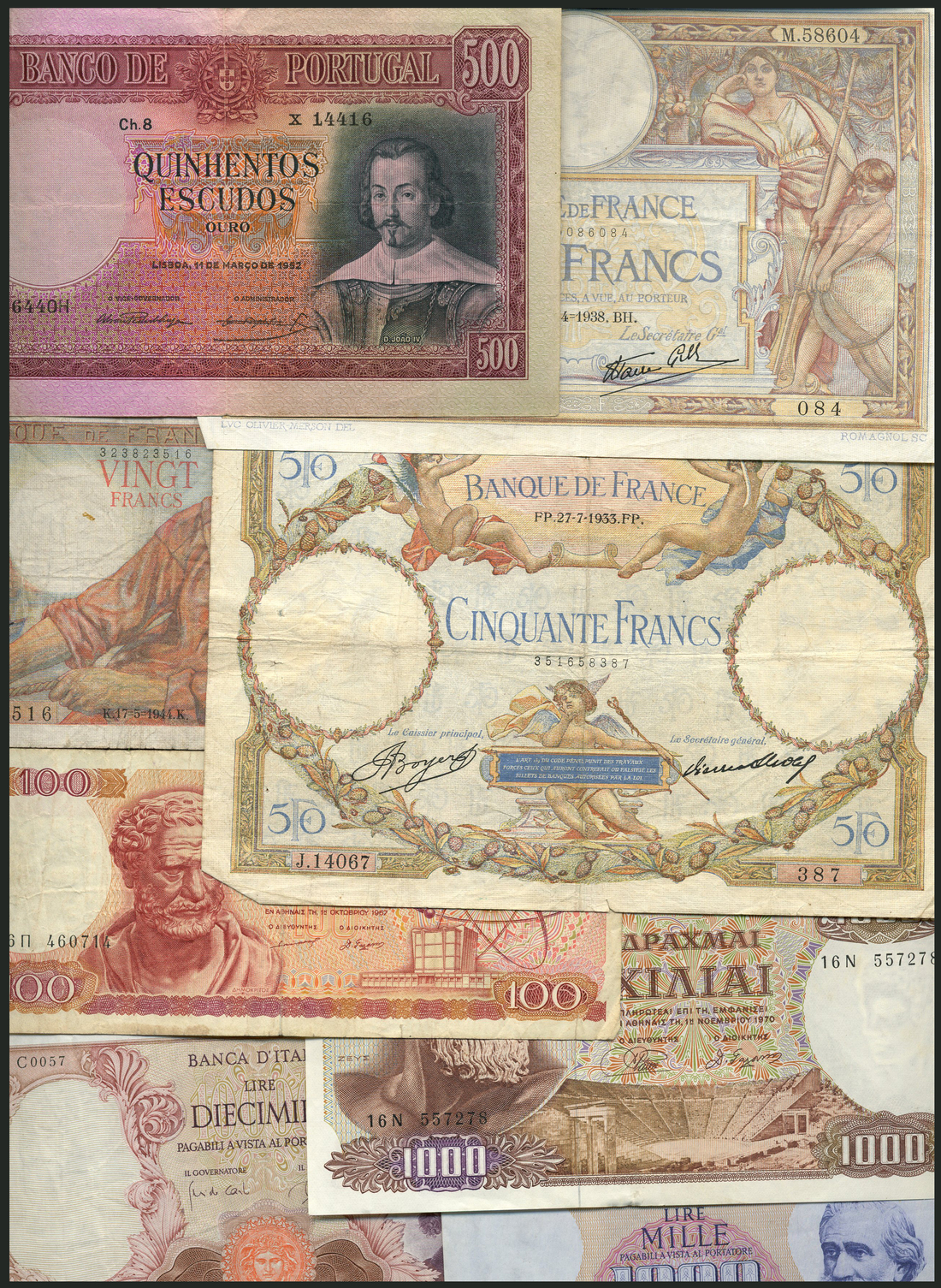 a mixed group of World Banknotes, from countries which include, Banco de Portugal, 1952, 500 escudos, Banque de France, 50 francs, 1933, 100 francs (7), 1930s, 20 francs, 1944, together with Greece, Italy, South Africa and Mexico