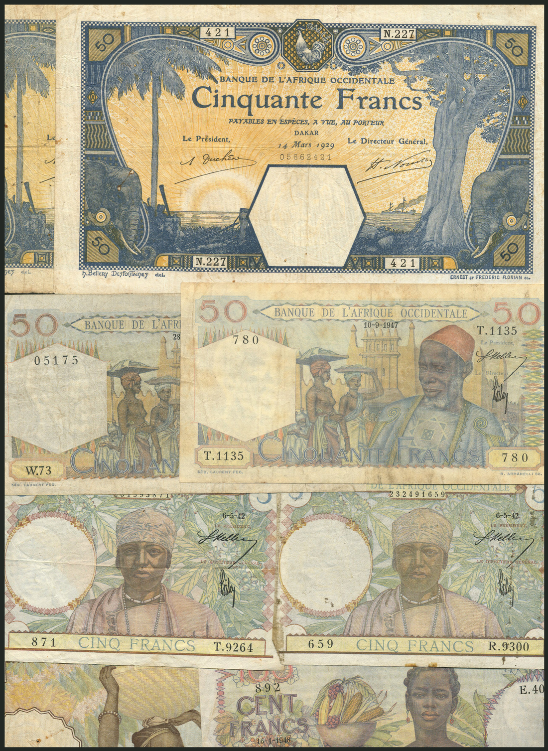 A large group of World Notes, including French West African States, 1000 francs (2), 1929, Dakar, 5, 25 and 100 francs from the 1919 issue, Banco Portugal, 50 centavos (8), 1918-1920, 1 escudo (8), 1917-1920, Albania, Italy, Banco di Napoli, Spain, Madagascar, India, Ethiopia, Greece, Jason Islands, Banque De l'Algrie, 500 francs, 1924,