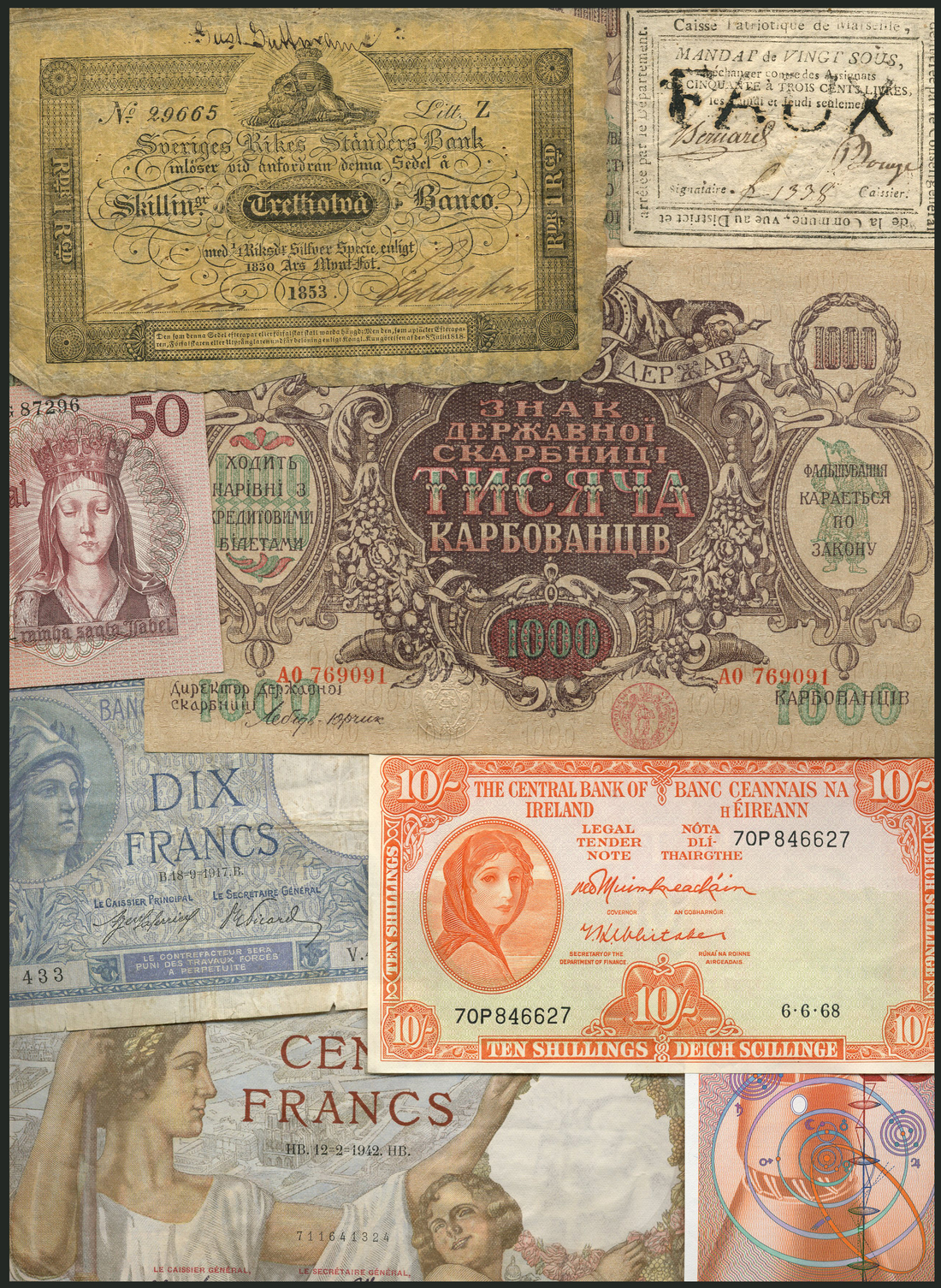 A sizable and varied group of World banknotes, including National Bank of Switzerland, 10 francs (2), 1979, 1983, 20 francs, 1978, 1983, 50 francs, 1985, 100 francs, 1975, Sveriges Rikes Standers Bank, 1 Rikes 1853Sweden, Portugal, France, Germany, Isle of Man,