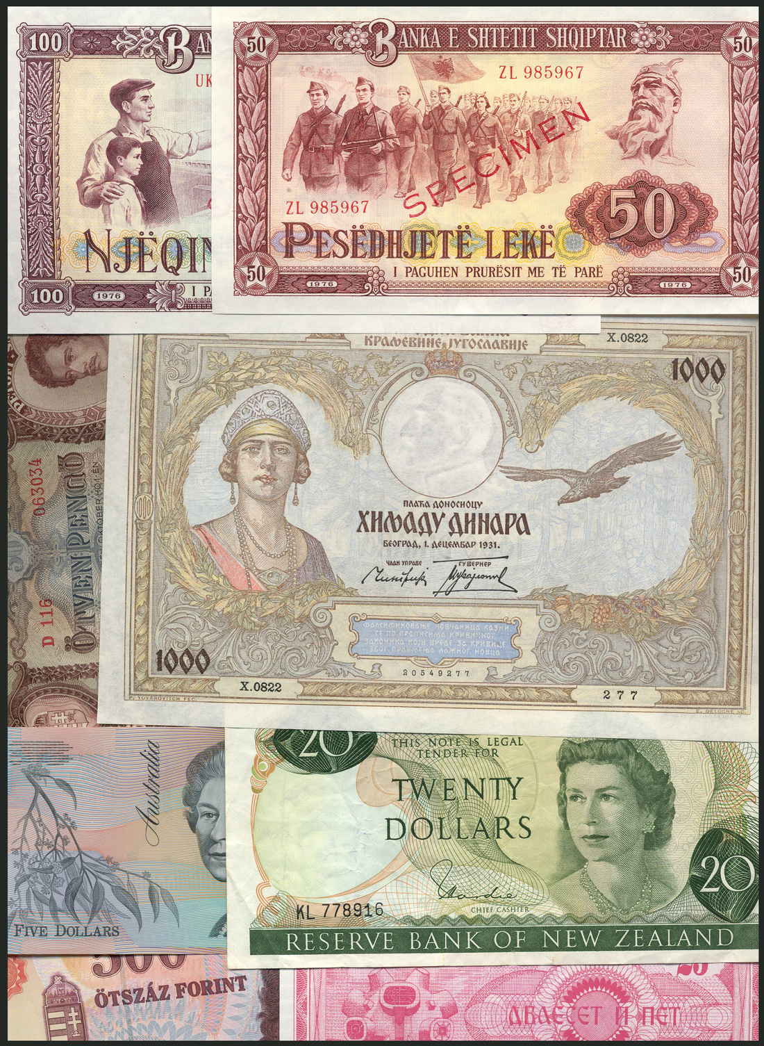 a large group of world banknotes, which include the following, Albania (7 specimens), Macedonia (6), Hungary (27), Russia (10), Yugoslavia (20), Germany (30), New Zealand (10), Australia (6), British Military (21), Italy (15), Spain (10), Portugal (10), France (6), Bulgaria (12), Greece (16), Norway (2), Netherlands (5), Austria (5), Luxembourg (2), Belgium (20) together with a further 14 notes from various countries