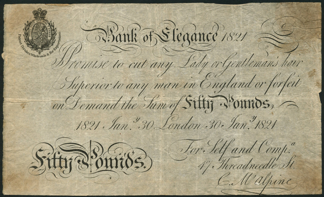 Bank of Elegance (Self and Comp), an advertising/skit note, 20 January 1921, a promise to cut any Lady or Gentleman's hair superior to any man in England, or forfeit on demand the sum of £50, printed signature of C.M'Alpine, arms at top left, 'value' at low left