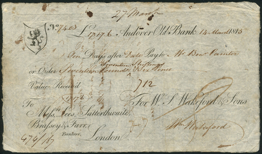 Andover Old Bank (W S Wakeford & Sons), a 10 day sight bill, 14 March 1815, serial number 7403 black and white, arms top left, manuscript signature of Wm. Wakeford low right