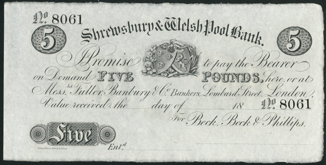 Shrewsbury & Welsh Pool Bank, (Beck, Beck & Phillips), an unissued £5, 18-, serial number 8061, black and white, value at lower left, top left, centre and top right, arms at centre, value on reverse in guilloche design