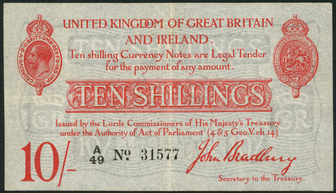 Treasury Series, John Bradbury, 10 shillings, ND (1914), serial number A49 31577, red, portrait King George V top left, St George and dragon top right, value at low left and in ornate tablet at centre