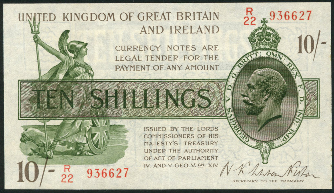 Treasury Series, N F Warren Fisher, £1, NDS (1922), serial number R22 936627, green and brown, portrait King Geo4rge V at right, Britannia at left, bank title top centre left, value low left, centre and top right