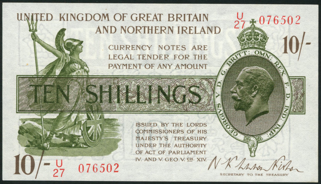 Treasury Series. N F Warren-Fisher, 10/-, ND (1927), red serial number U/27 076502, brown, lilac and green, portrait of George V at right, value in panel at centre, Britannia at left