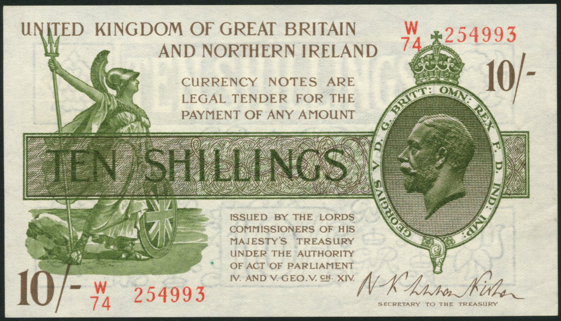 Treasury Series, N F Warren Fisher, 10/-, ND (1927), serial number W/74 254993, brown, purple and olive green, crowned vignette of George V at right, Britannia at left, value in tablet at centre, Northern Ireland type