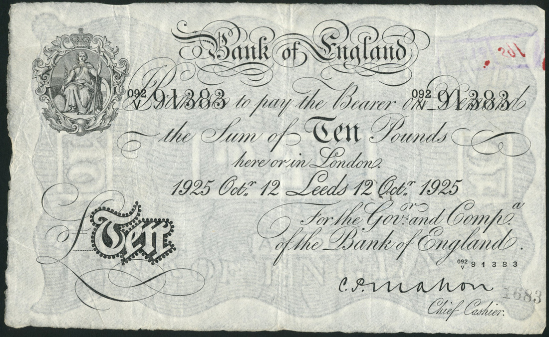 Bank of England, C P Mahon, £10, Leeds, 12 October 1925, serial number 092/V 91383, black print, ornate crowned vignette of Britannia at top left, value in black tablet at low left