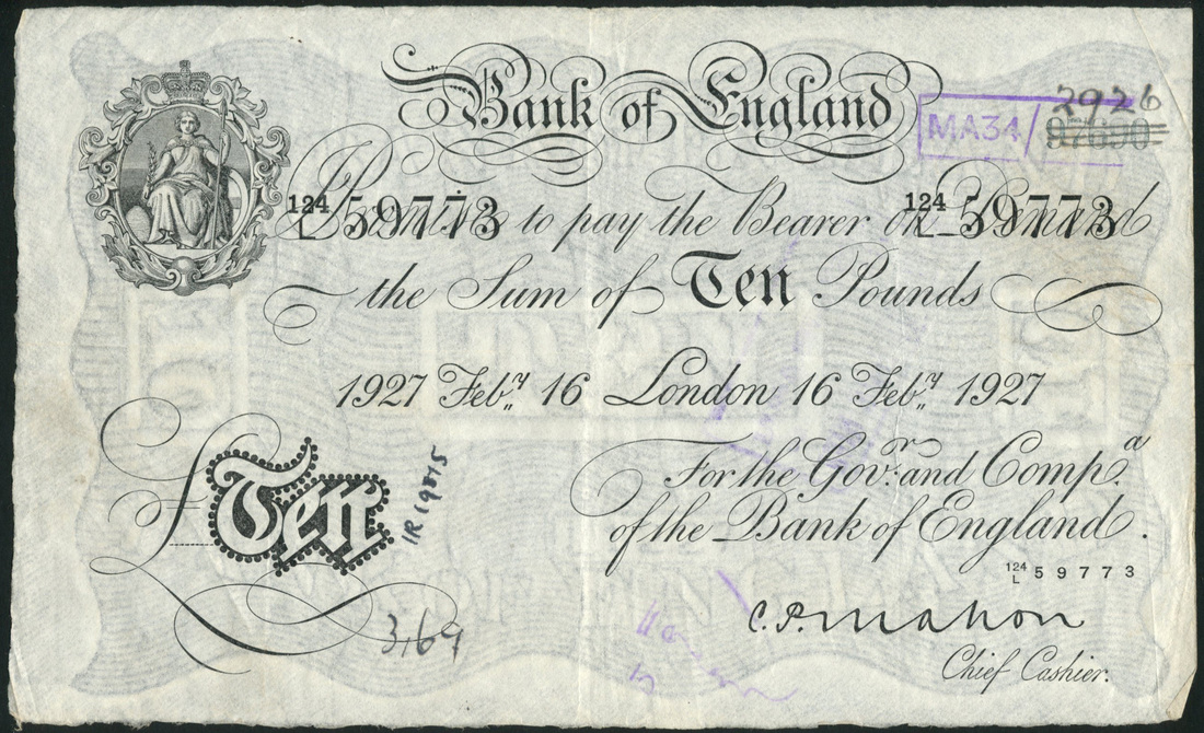 Bank of England, C P Mahon, £10, London, 16 February 1927, serial number 124/L 59773, black and white, ornate crowned vignette of Britannia at top left, value in black tablet at low left